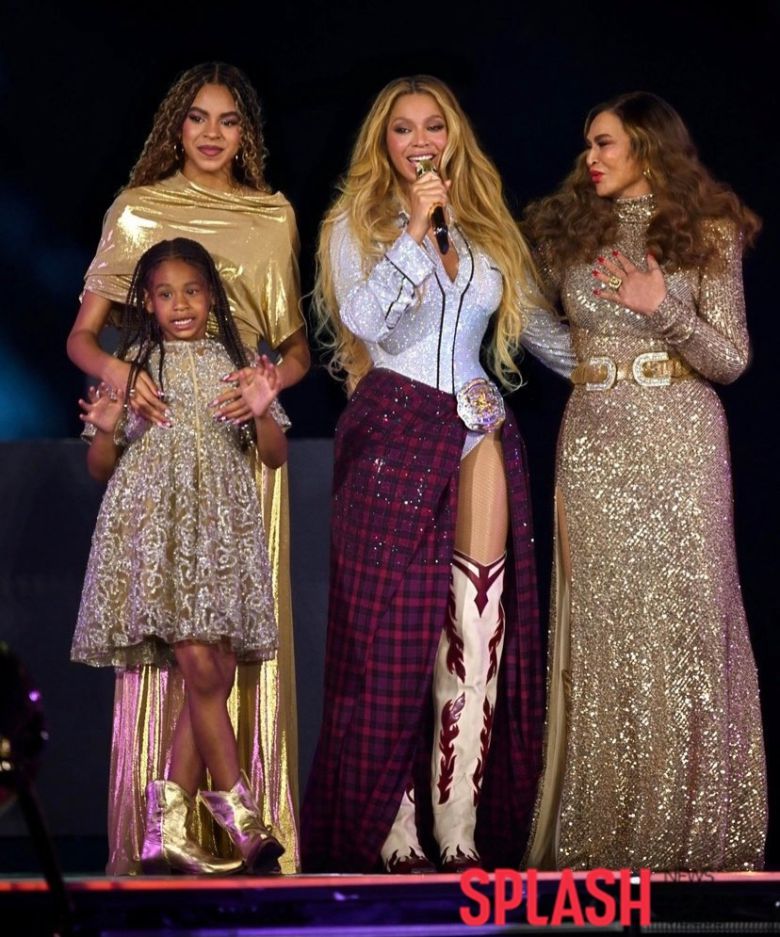 사진 속 비욘세는 화려한 보디 슈트에 드레이핑 스커트를 매치한 패션으로 등장했다. 이어 금색 드레스를 입은 비욘세의 어머니 티나 놀스, 금색 숄더를 두른 듯한 드레스를 입은 첫째 딸 블루 아이비 카터(13)가 함께 나왔다. 또한 미니 드레스를 입은 둘째 딸 루미 카터(8)도 등장해 눈길을 끈다.