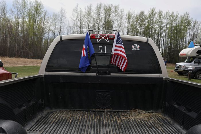 3일(현지시간) 캐나다 앨버타주에서 열린 앨버타주 독립 관련 회의장 밖에 있는 트럭에 앨버타주 주 깃발과 미국 성조기가 장식돼 있다. 로이터연합뉴스