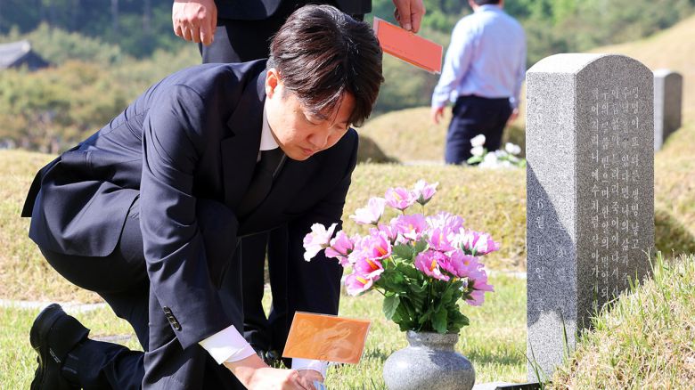 ▲ 4일 오전 광주 북구 국립 5·18 민주묘지에서 이준석 개혁신당 대선 후보가 참배하고 있다.