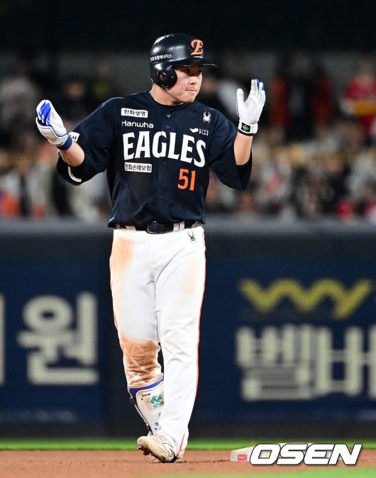 [OSEN=광주, 지형준 기자] 2일 오후 광주-기아 챔피언스필드에서 2025 신한 SOL Bank KBO리그 KIA 타이거즈와 한화 이글스의 경기가 열렸다.5연승에 도전하는 한화는 엄상백을, 연패를 막아야 하는 KIA는 아담 올러를 선발로 내세웠다.8회초 2사에서 한화 문현빈이 2루타를 날리며 기뻐하고 있다. 2025.05.02 /jpnews@osen.co.kr