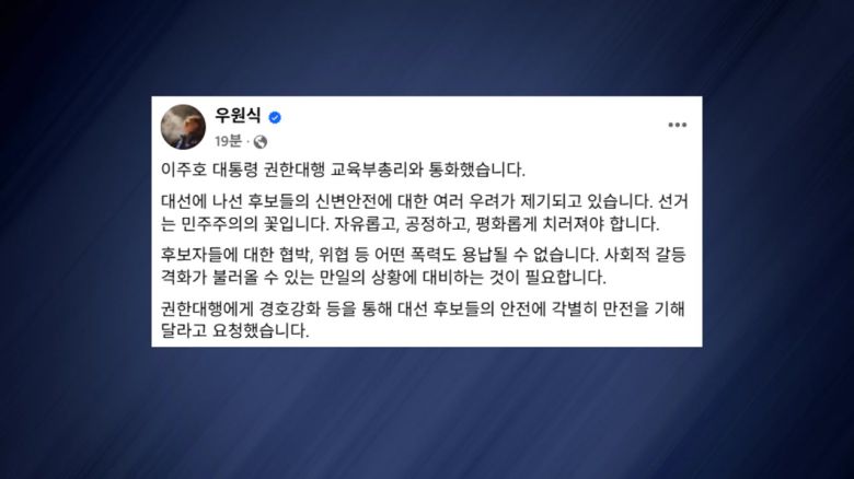 우 의장은 SNS에서 선거는 민주주의의 꽃인 만큼 후보자들에 대한 협박, 위협 등 어떤 폭력도 용납될 수 없다면서 이같이 밝혔습니다.