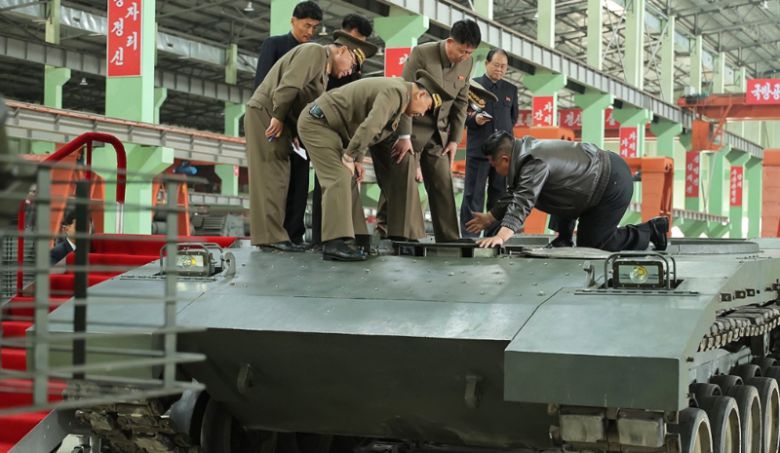 김정은 "2차 장갑무력혁명 일으켜야"…무릎 꿇고 탱크 살폈다
