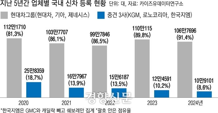 중견 3사의 연도별 신차 등록 대수는 2020년(25만8359대)을 마지막으로 20만대 벽이 깨졌다. 이후 2021년 16만7967대, 2022년 15만6187대, 2023년 12만4591대로 꾸준히 감소했다.