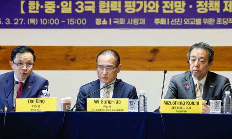 다이빙 주한중국대사가 3월 27일 서울 여의도 국회 사랑재에서 열린 한·중·일 3국협력 전문가 대화에 참석해 축사하고 있다. 왼쪽부터 다이빙 대사, 선진 외교를 위한 초당적 포럼 대표 위성락 더불어민주당 의원, 미즈시마 고이치 주한일본대사. 뉴스1