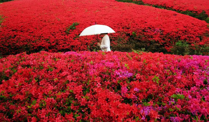 지난달 22일 경기도 수원시 팔달구 수월월드컵경기장 인근에서 우산을 쓴 시민이 활짝 핀 철쭉 사이를 지나고 있다.(사진=연합뉴스) |