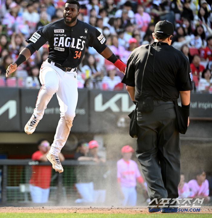 4일 광주KIA챔피언스필드에서 열린 한화와 KIA의 경기, 8회초 1사 만루 한화 이진영의 희생플라이때 3루주자 플로리얼이 득점을 성공한 후 기뻐하고 있다.광주=허상욱 기자wook@sportschosun.com/2025.05.04/ |