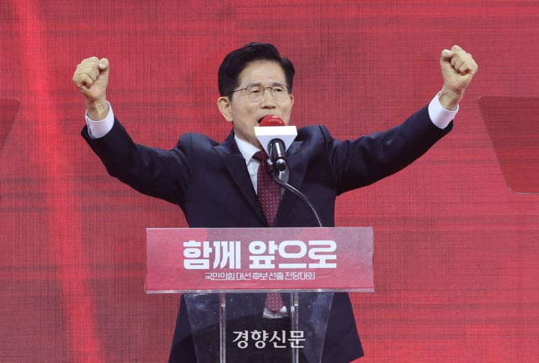 국민의힘은 지난 3일 경기 고양시 킨텍스에서 전당대회를 열고 김 후보를 당 대선 후보로 선출했다. 김 후보는 당원 선거인단 투표와 국민여론조사를 각각 50%씩 반영해 합산한 전체 득표율에서 56.53%로 과반을 얻었다. 경쟁자였던 한동훈 후보는 43.47%에 그쳤다.