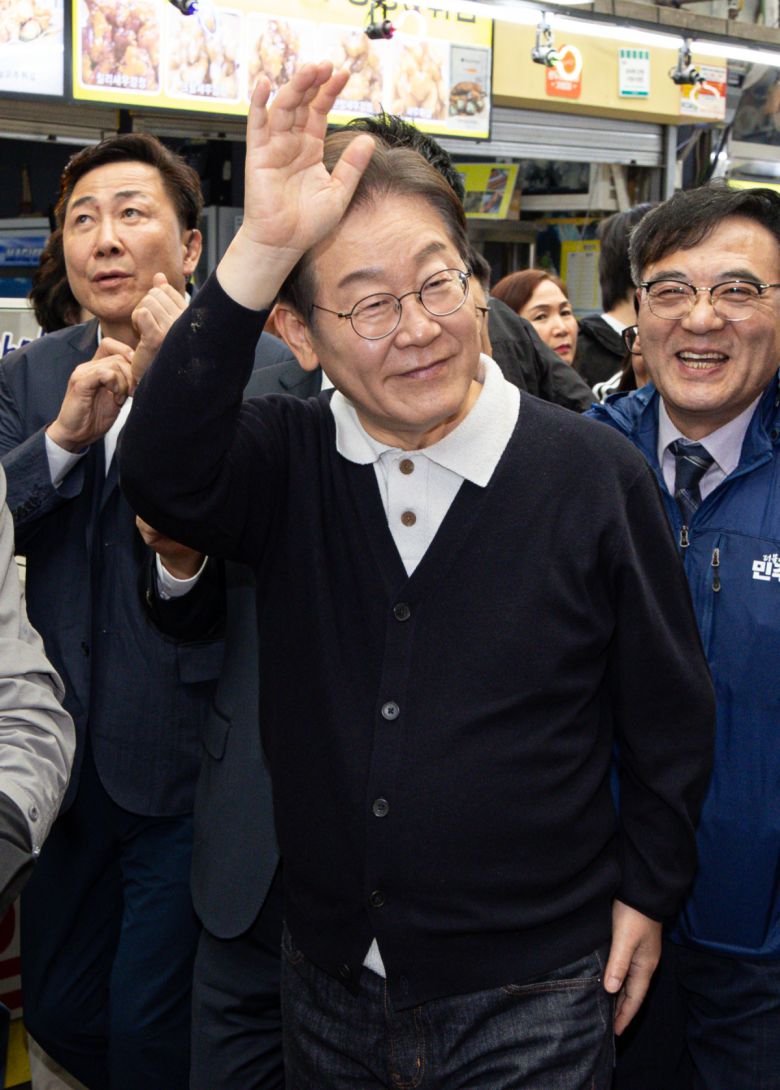 ‘골목골목 경청투어 : 단양팔경편’에 나선 이재명 더불어민주당 대통령 후보가 4일 오전 충북 단양군 단양구경시장에서 시민들을 향해 손을 흔들어 인사하고 있다. 2025.5.4 뉴스1 |