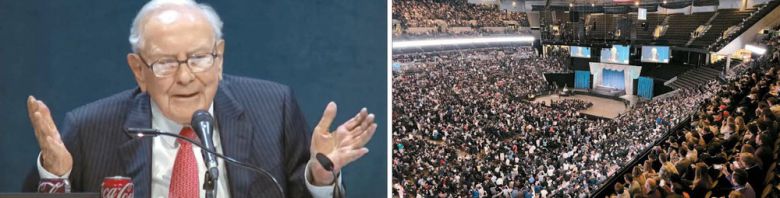 3일(현지시간) 미국 네브래스카주 오마하 CHI헬스센터에서 열린 버크셔해서웨이 주주총회에서 워런 버핏 회장이 주주들을 상대로 발언하고 있다. 오른쪽 사진은 전 세계에서 온 주주 등 4만명이 주총장에 운집한 모습. CNBC 캡처·윤원섭 특파원 |