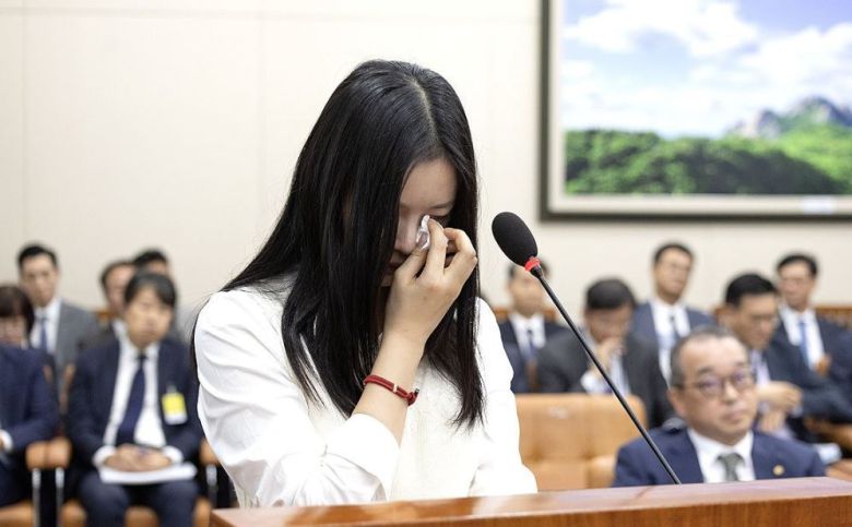 뉴진스 하니가 지난 2024년 10월 서울 여의도 국회에서 열린 환경노동위원회 국정감사에서 눈물을 닦고 있다. 연합