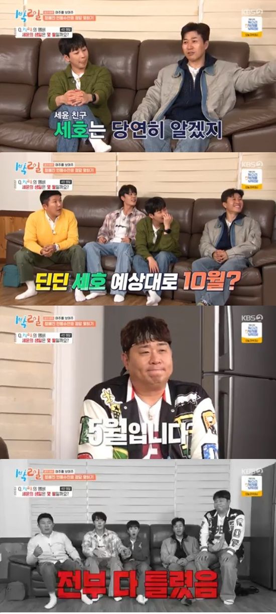 딘딘과 조세호는 10월, 김종민은 11월, 유선호는 7월이라고 말했다. 다섯 번째 순서로 등장한 문세윤은 자신의 생일은 5월이라고 얘기했다.