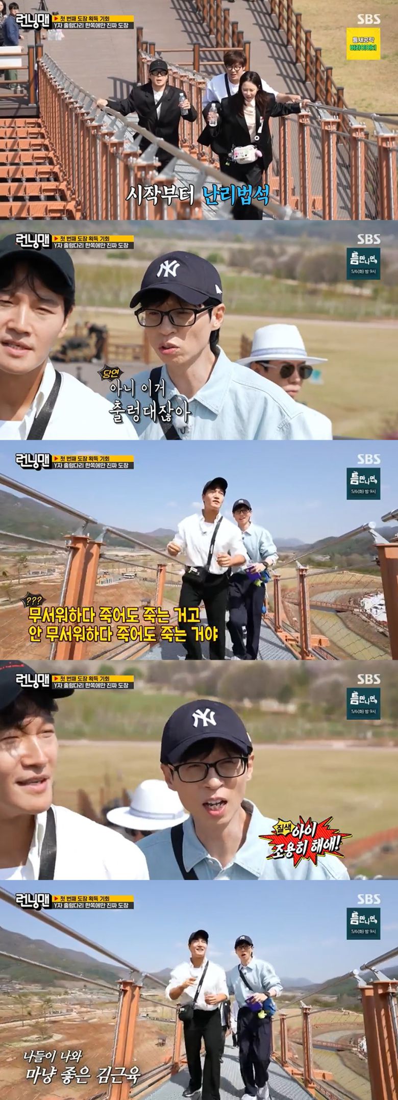 다급해진 유재석과 지석진은 "빨리 가!"라며 황급히 다리를 건넜고, 김종국은 마치 운동을 하듯 온몸을 흔들며 전진했다.