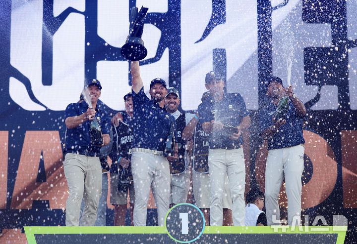 [인천=뉴시스] 홍효식 기자 = 브라이슨 디섐보가 이끄는 크러셔스 GC 팀이 4일 인천 연수구 송도 잭 니클라우스 골프클럽 코리아에서 열린 LIV 골프 코리아 시상식에서 우승 세리머니를 하고 있다. 2025.05.04. yesphoto@newsis.com |