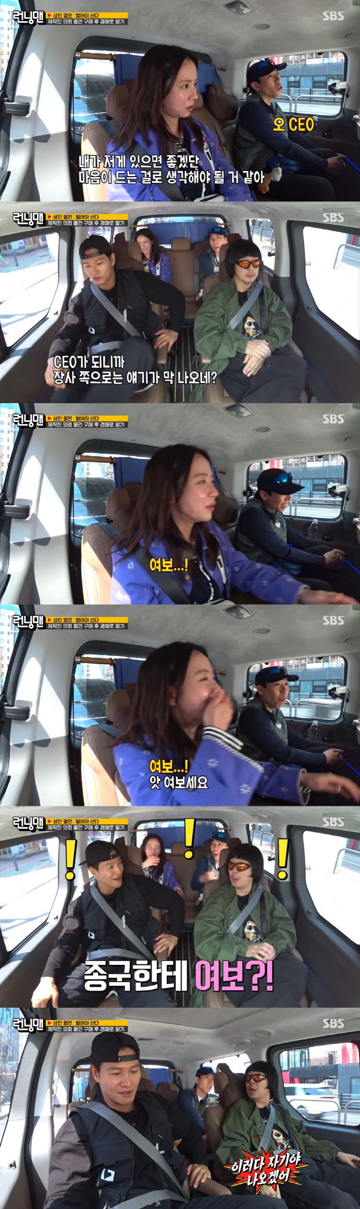 그때 송지효는 김종국을 향해 '여보세요'라는 걸 '여보'라고 잘못 말해 김종국까지 당황하게 만들었다. 양세찬은 "여보? 잠깐만"이라고 했고, 하하 또한 "이거 뭐냐. 이건 짚고 넘어가자"라고 했다.