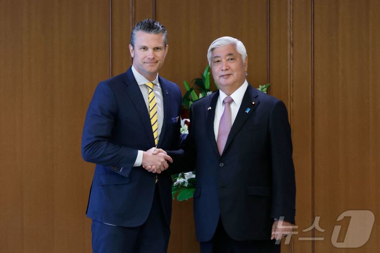 피트 헤그세스 미국 국방 장관이 30일(현지시간) 도쿄 방위성에서 나카타니 겐 일본 방위상과 회담에 앞서 악수를 하고 있다. 2025.03,30 ⓒ AFP=뉴스1 ⓒ News1 우동명 기자
