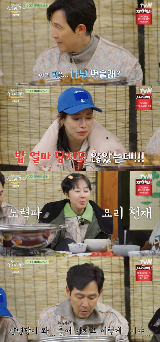 걱정과 달리, 이정재는 감자탕을 맛 보더니 “맛있다. 음식 잘하신다. 이렇게 많은 양의 간을 맞추기 어렵다는데”라고 염정아 요리 실력에 감탄했다. 이어 그는 못 먹을 것처럼 하더니 폭풍 흡입도 모자라 멤버들이 밥까지 볶아 먹자 함께 즐기는 모습을 보였다.