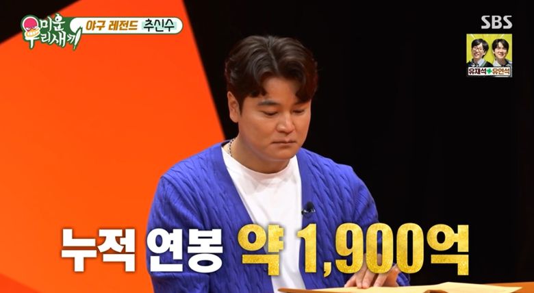추신수는 메이저리그에서 활약하며 어마어마한 기록을 세운 것으로도 유명하다. 그의 누적 연봉은 무려 약 1,900억 원에 달했고, 서장훈은 "역대 한국인 메이저리거 연봉 1위다. 아시아 선수 최초 메이저리그 200호 홈런을 기록했고, 한국 리그 최고령 타자 기록도 있다"며 그의 화려한 커리어를 소개했다.