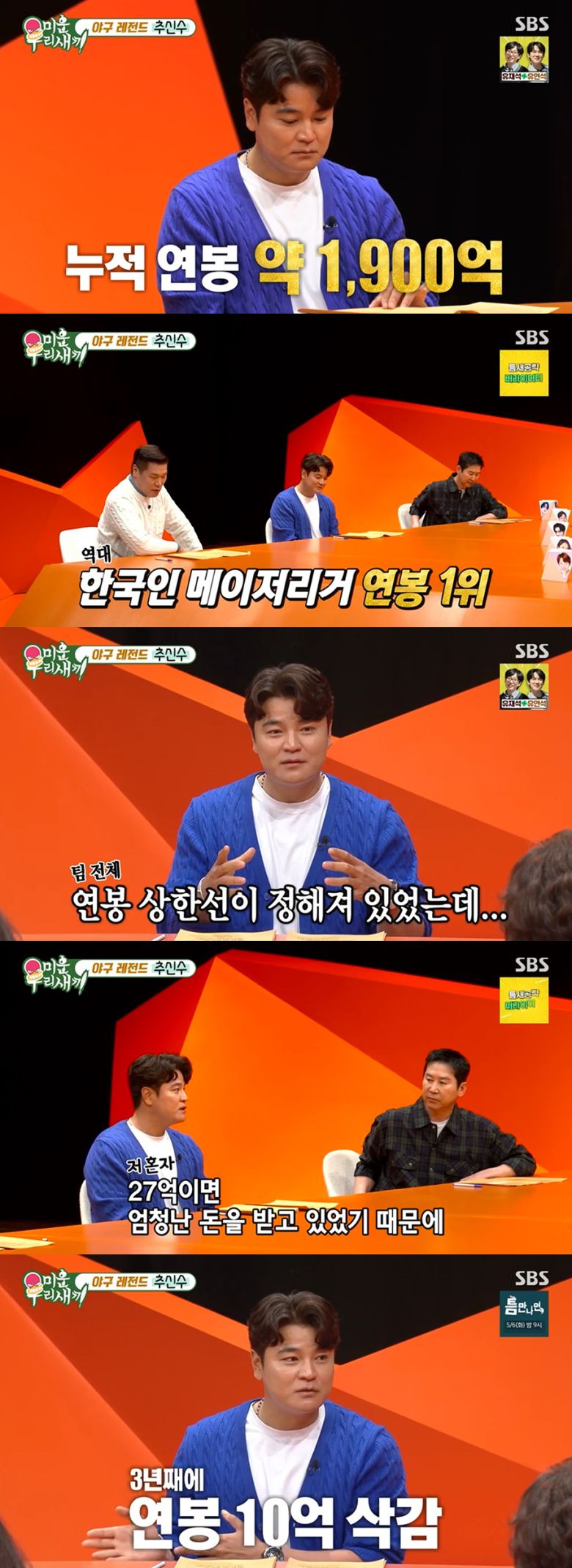 뿐만 아니라 추신수의 누적 기부액은 약 25억 원에 이른다. 신동엽이 "억대 연봉 1위라는데 역봉 삭감으로도 1위했다더라"고 묻자, 추신수는 "미국에서 한국으로 올 때 27억이라는 연봉을 정하고 왔다"고 운을 뗐다.