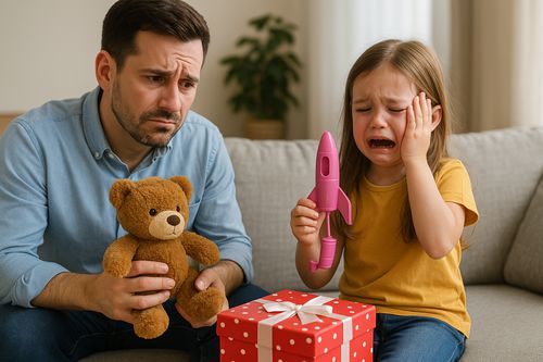 어린이날을 맞아 아버지가 선물을 사왔는데 불량인 것을 보고 우는 딸의 모습. [사진 = 챗GPT]