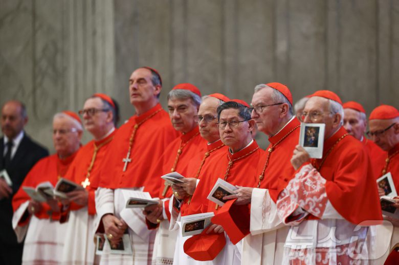 루이스 안토니오 타글레와 피에트로 파롤린 등 추기경들이 바티칸 성베드로 성당 내에 모여 있다. 이날 앞서 교황이 안치된 관이 대성당 내부로 옮겨졌다. 2025.04.23 ⓒ 로이터=뉴스1 ⓒ News1 최종일 선임기자 |