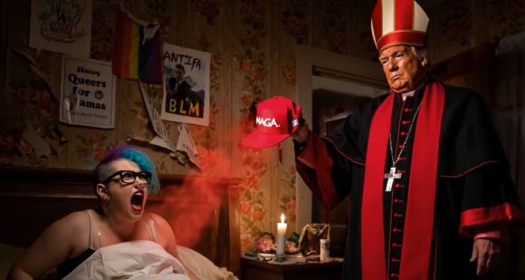 이 영상은 트럼프가 교황 복장을 하고 퇴마 의식을 행하거나 거대 독수리를 타는 모습이 담겨 있고, 일론 머스크가 추기경으로 등장하며, 트럼프 비판자인 로버트 드 니로가 교황의 반지에 입 맞추는 장면까지 포함돼 ‘신성모독’이라는 비판이 쏟아지고 있다.
