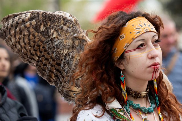 ▲5월 1일(현지시간) 콜로라도주 덴버에서 열린 트럼프의 이민 정책 반대 집회에 참가한 한 시민이 멕시코 아즈테카 문명 전통 복장을 입고 있다. ⓒAFP=연합뉴스