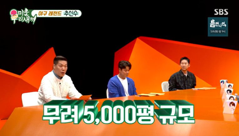 이날 서장훈은 화제가 됐던 추신수의 미국 초호화 저택을 언급하며 "규모가 5000평이 넘고 수영장, 영화관, 박물관까지 있다고 들었다, 화장실이 14개라더라"고 말해 스튜디오를 술렁이게 했다. 특히 자료화면에서 배딩 케이지까지 설치된 야구 연습장이 보이자 패널들은 감탄했다.