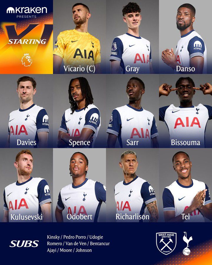 히샬리송과 마티스 텔, 윌슨 오도베르, 데얀 쿨루셉스키, 이브 비수마, 파페 사르, 제드 스펜스, 벤 데이비스, 케빈 단소, 아치 그레이, 골키퍼 굴리엘모 비카리오가 선발 명단에 이름을 올렸다.