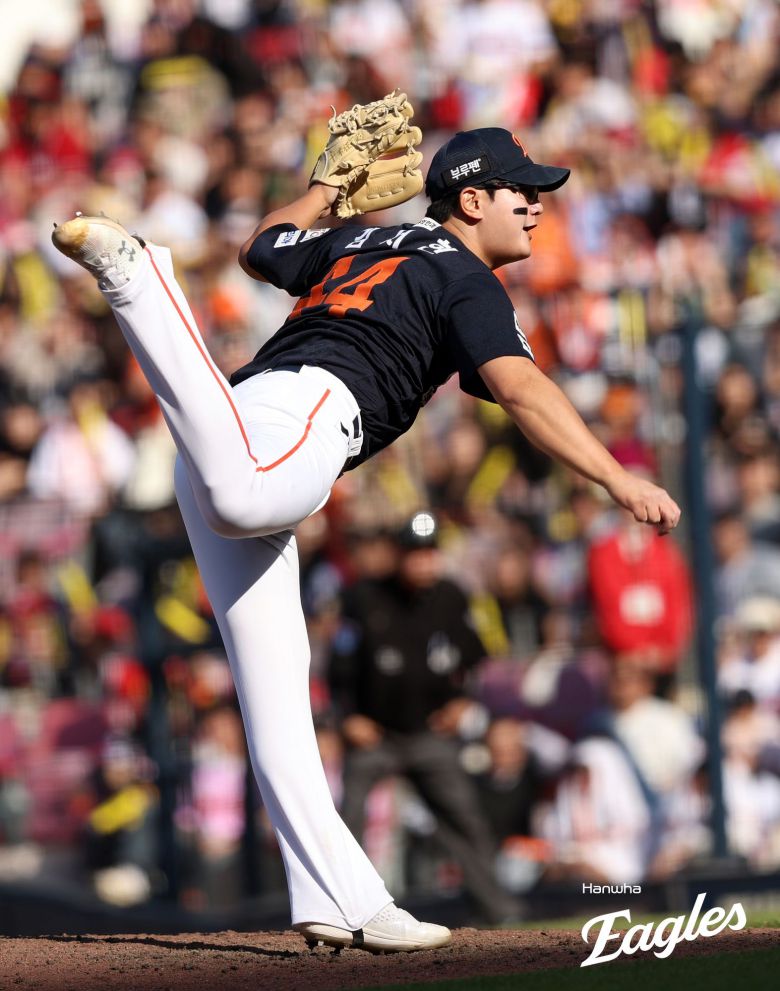 그리고 8회말 폰세에 마운드를 넘겨받은 한승혁이 한준수를 2루수 땅볼 처리, 최원준과 박찬호에게 연속 삼진을 솎아내고 리드를 지켰고, 여전히 3-1, 2점 차에서 마무리 김서현이 9회말 등판. 김서현은 위즈덤을 상대로 3볼-1스트라이크에 몰렸지만 직구로 연속해 헛스윙을 이끌어내며 위즈덤을 삼진 처리했다.