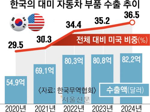 한국무역협회에 따르면 미국은 한국의 최대 자동차 부품 수출 시장으로, 한국의 자동차 부품 대미 수출 비중은 2020년 29.5%에서 지난해 36.5%로 증가했다. 지난해 미국의 자동차 부품 수입 가운데 한국의 비중은 6.4%다. 관세 조치의 대상이 되는 자동차 부품 품목은 332개에 이른다. 올해 하반기 개시될 미국·멕시코·캐나다무역협정(USMCA) 재검토 협상에서 원산지 기준 강화가 유력한 만큼 장기적으로 한국산 자동차 부품의 미국산 대체 가능성도 있다. 이항구 한국자동차연구원 연구위원은 “현대차 등이 미국 현지 생산을 늘려도 국내 생산은 줄어들고, 장기적으로 완성차·부품업계뿐 아니라 간접적으로 연관된 지역상권까지 10만명의 일자리가 위협받을 수 있다”고 우려했다.