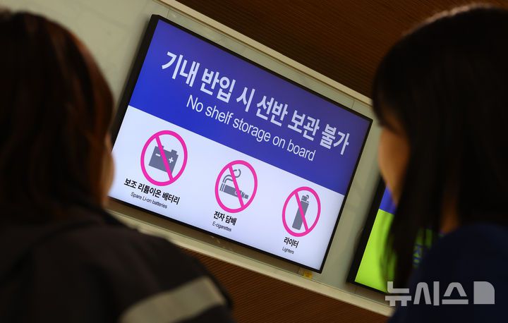 [인천공항=뉴시스] 김선웅 기자 = 12일 인천국제공항 출국장에서 기내 보조배터리 반입 관련 내용이 안내되고 있다.국토교통부는 지난 1일부터 보조배터리, 전자담배의 기내 안전관리 체계 강화 표준안을 시행했다. 보조배터리는 100Wh 이하 최대 5개까지, 100Wh~160Wh는 항공사 승인 하에 2개까지만 기내 반입이 허용되며 160Wh를 초과하는 경우 기내 반입이 금지된다. 반입이 승인된 보조배터리는 단자가 금속과 접촉하지 않도록 절연테이프를 붙이거나 보호형 파우치 또는 비닐봉투에 넣어서 보관해야하며 좌석 위 선반에는 보관할 수 없다. 2025.03.12. mangusta@newsis.com |
