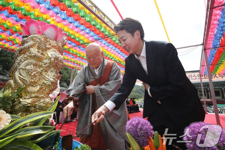이준석 개혁신당 대선후보(오른쪽)가 5일 오전 대구 동구 동화사 통일대불광장에서 열린 불기 2569년 부처님 오신 날 봉축대법회에 참석해 의현 스님과 관불 의식을 하고 있다. 2025.5.5/뉴스1 ⓒ News1 공정식 기자 |