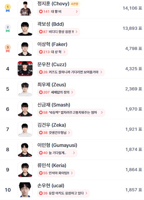 2위는 곽보성(Bdd)으로, 13,893표를 획득하며 정지훈과 단 213표 차이로 접전을 벌였다. "비디디 항상 응원 !!"이라는 메시지처럼, 날카로운 한타 설계와 경기의 흐름을 바꾸는 캐리력으로 팬들의 굳건한 지지를 받고 있다. LCK 내 꾸준한 퍼포먼스를 통해 여전히 강력한 미드라이너 중 한 명으로 평가받고 있다.
