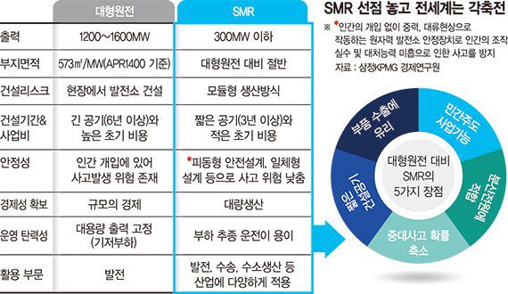 SMR은 주요 기기를 모듈화해 공장에서 제작한 후 현장에서 조립할 수 있도록 설계한 발전용량 300㎿ 이하의 소형 원자로다. 발전용량 1000㎿ 이상 대형 원전 대비 절반 이하 부지에 건설이 가능하며 건설 기간과 비용도 절감할 수 있다.