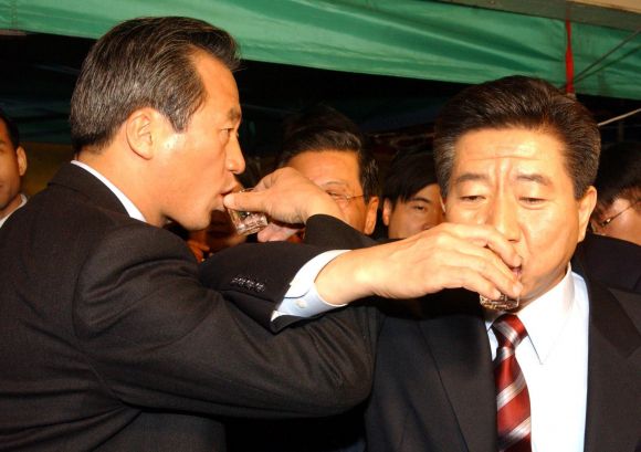 김문수 국민의힘 대선 후보와 한덕수 전 국무총리의 단일화 논의가 본격화할 예정인 가운데 방식으로는 ‘노무현·정몽준’ 모델이 주로 거론된다. 사진은 2002년 11월 15일 저녁 노무현(오른쪽) 새천년민주당 대선 후보와 정몽준 국민통합21 대선 후보가 국민여론조사에 의한 후보 단일화에 합의한 뒤 서울 여의도의 한 포장마차에서 소주잔으로 러브샷을 하는 모습. 서울신문 DB |