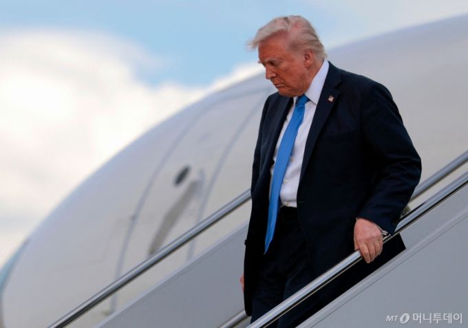 도널드 트럼프 미국 대통령이 지난 1일(현지시간) 앨라배마주 터스컬루사에 있는 앨라배마 대학에서 졸업식 축사를 하기 위해 터스컬루사 국제 공항에 도착을 하고 있다. /터스컬루사 AFP=뉴스1 |