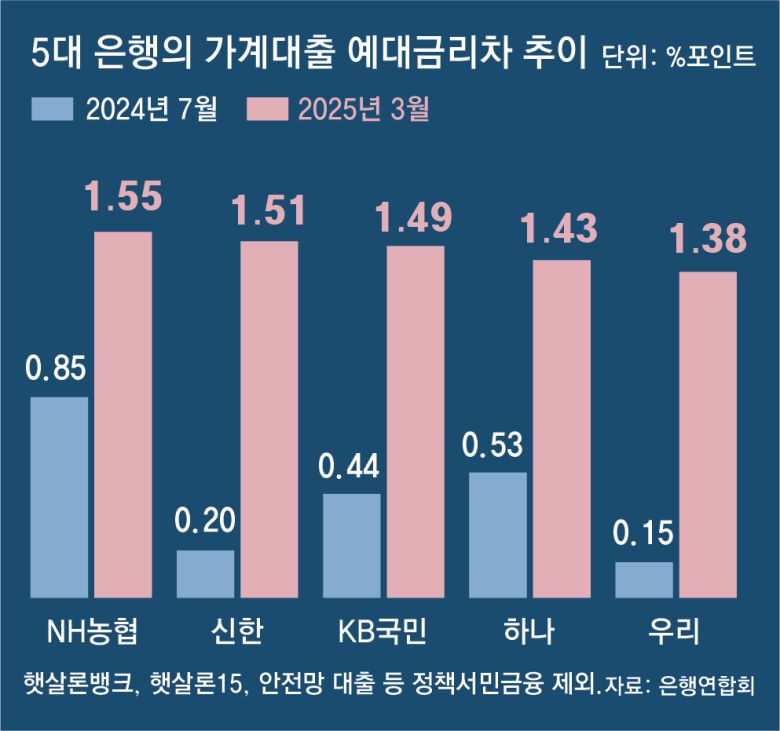 5일 은행연합회 소비자 포털에 공시된 ‘예대금리 차 비교’ 통계에 따르면 올해 3월 KB국민, 신한, 하나, 우리, NH농협은행 등 5대 은행에서 취급된 가계대출의 예대금리 차는 1.38∼1.55%포인트로 집계됐다. 농협은행의 예대금리 차가 1.55%포인트로 가장 컸고 신한(1.51%포인트), 국민(1.49%포인트), 하나(1.43%포인트), 우리은행(1.38%포인트) 순이었다. 이는 햇살론뱅크, 안전망 대출 등 서민금융 상품을 빼고 산출한 결과다.
