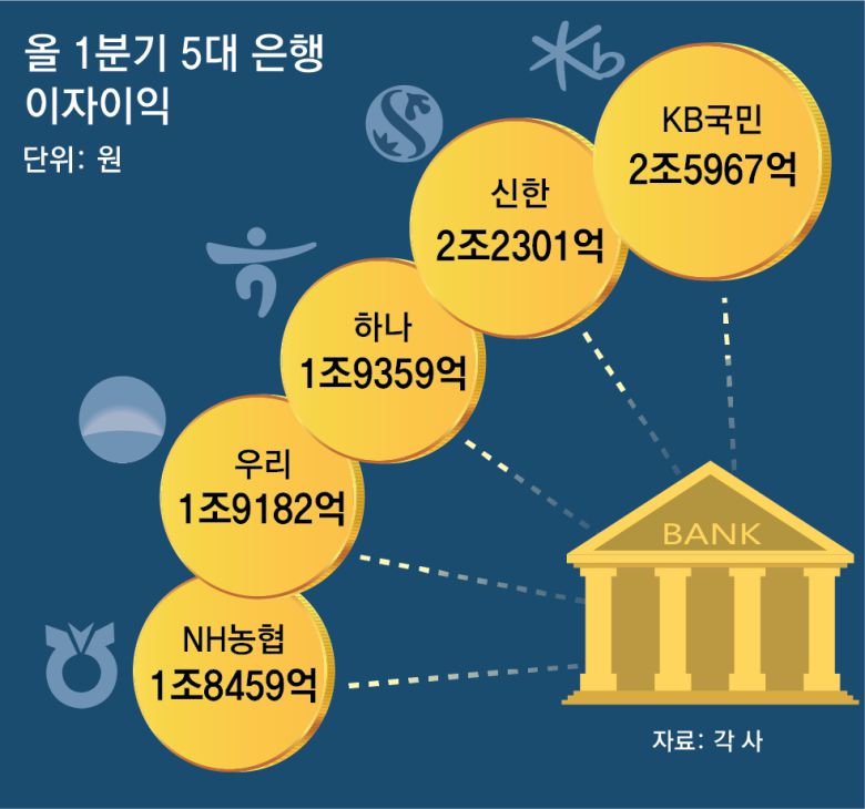 특히 최근 주요 은행들의 예대금리 차는 은행연합회 공시가 시작된 2022년 7월 이후 최대치를 경신 중이다. 신한·하나은행의 3월 예대금리 차는 공시 집계 이후 2년 9개월 새 가장 컸고, 국민은행은 2023년 1월 이후 2년 2개월 만에 가장 크게 벌어졌다. 우리은행과 농협은행의 예대금리 차도 각각 2년 1개월, 1년 4개월 만에 최대 폭이다. 예대금리 차가 커지면 은행들의 이자 이익은 늘어난다. 올 1분기(1∼3월)에만 10조5268억 원의 이자 이익을 벌어갔다. 전년보다 169억 원(0.2%) 증가한 규모다.