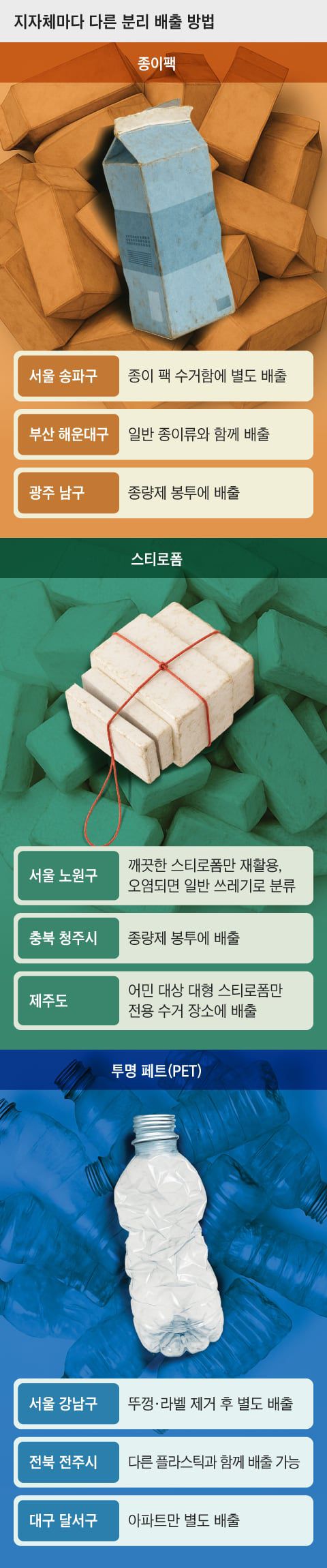 냉장·냉동식품을 배송할 때 쓰는 스티로폼은 테이프·스티커 등 이물질 제거 후 버리는 것이 원칙이다. 그런데 ‘이물질’이라는 기준이 모호해서 지자체마다 처리 방식이 제각각이다. 서울 노원구는 깨끗한 스티로폼은 재활용으로, 오염도가 심하면 일반 쓰레기로 버리도록 하고 있다. ‘심한 오염도’의 기준은 배출자 판단에 달려 있어서 사실상 재활용하지 않아도 문제는 없다. 반면 스티로폼 공공 처리 설비가 적은 충북 청주시는 일부만 재활용되고 여전히 종량제 처리가 많은 것으로 나타났다. 제주도는 어민을 대상으로 대형 스티로폼만 전용 수거 장소로 직접 운반해 버리도록 하고 있다.