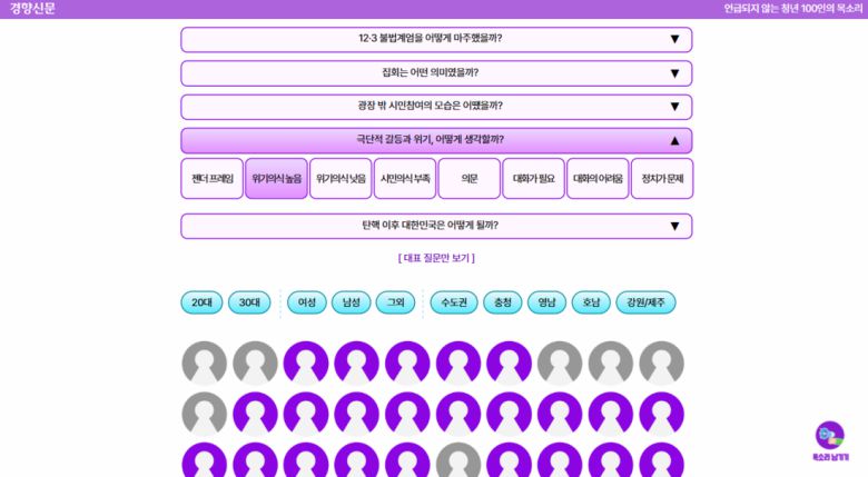청년참여연대 등 25개 청년 시민사회단체가 함께하는 ‘불평등 물어가는 범청년행동(이하 범청년행동)’은 집회 경험이 없거나 한 차례뿐인 20~30대 100명을 만나 인터뷰를 진행했습니다. 경향신문 데이터저널리즘팀 다이브는 범청년행동과 ‘언급되지 않는 청년 100인의 목소리’ 프로젝트의 데이터를 분석했습니다.