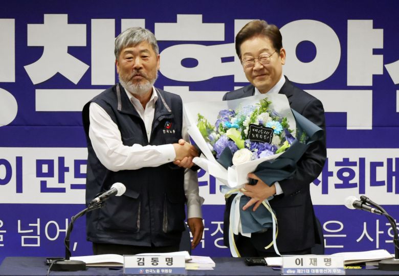 이재명 더불어민주당 대선후보 1일 오후 서울 중구 한국프레스센터에서 열린 한국노총 정책협약식에서 김동명 한국노총 위원장으로부터 꽃다발을 받은 뒤 기념촬영하고 있다. |
