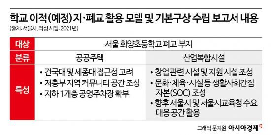 용역 조사에는 공공주택 또는 산업복합시설 조성이 활용안으로 담겨 있다. 보고서는 화양초 부지에 공공주택을 짓는 것에 대해 "1인 및 2인 가구가 많은 지역 특성과 건국대, 세종대를 비롯해 양호한 광역 접근성 등을 고려해 공공주택을 조성한다"며 "대상지를 둘러싸고 있는 저층 주거지역을 고려한 주변 지역과 조화로운 공간을 계획한다"고 설명했다.