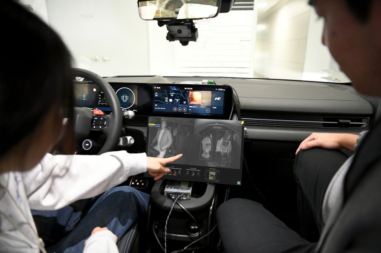 현대모비스 연구원들이 차량 내 ‘인캐빈 모니터링 시스템’을 테스트하고 있다. [현대모비스 제공] |