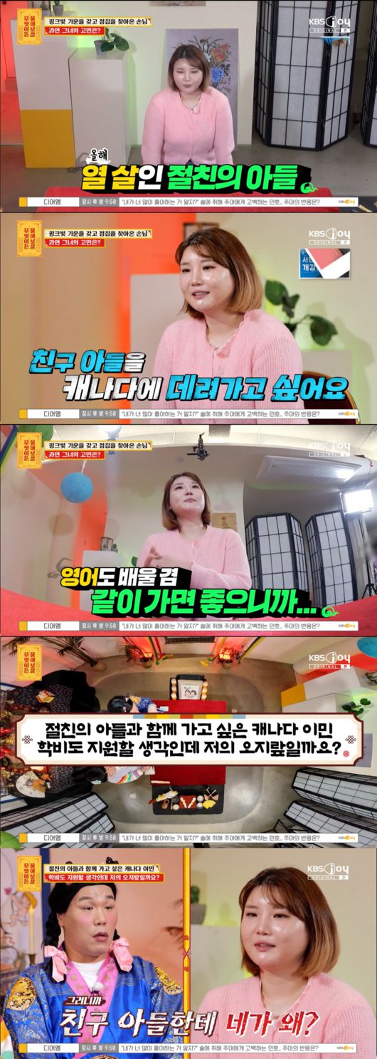 5일 전파를 탄 KBS Joy 예능프로그램 ‘무엇이든 물어보살’에는 올해 9월 캐나다 이민을 앞두고 절친의 아들을 캐나다에 데려가고 싶어 반년째 설득 중이라는 사연자가 출연했다.