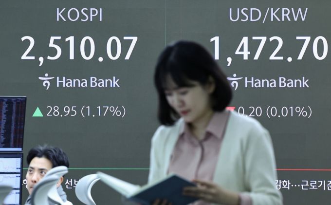 (서울=뉴스1) 김도우 기자 = 공매도 재개 이튿날인 4월1일 오전 서울 중구 하나은행 본점 딜링룸 전광판에 코스피와 코스닥, 원·달러 환율 개장 시황이 표시되고 있다. 이날 코스피는 전거래일 대비 30.12p(1.21%) 상승한 2511.24, 코스닥은 전날 대비 8.73p(1.30%) 오른 681.58에 거래를 시작했다. 원·달러 환율은 전거래일 대비 0.1원 오른 1473.0에 출발했다. 2025.4.1/뉴스1 Copyright (C) 뉴스1. All rights reserved. 무단 전재 및 재배포, AI학습 이용 금지. /사진=(서울=뉴스1) 김도우 기자 |