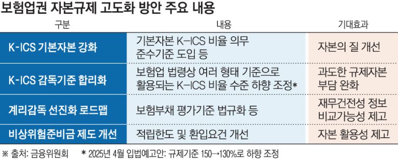 주요 논의 내용에는 △기본자본 K-ICS 비율 의무 준수기준 도입 △K-ICS 규제상 비율 기준 하향 조정 △계리감독 선진화 로드맵 추진 △비상위험준비금 제도개선 등이 포함됐다. 금융당국은 관련 시행령, 감독규정 개정안을 입법 예고했고, 오는 3분기 내 개정을 완료할 예정이다.