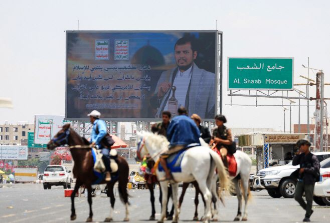 말을 탄 사람들이 5일(현지시간) 예멘 사나에서 후티 반군 지도자 압둘 말릭 알후티가 등장하는 디지털 광고판 앞에 서 있다./EPA·연합 |