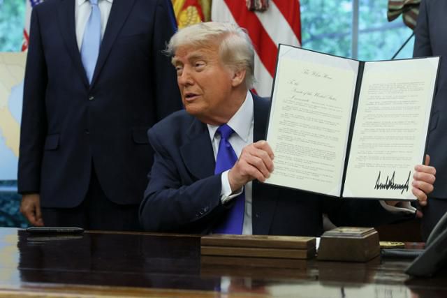 도널드 트럼프 미국 대통령이 5일 워싱턴 백악관 집무실(오벌오피스)에서 행정명령과 포고문에 서명한 뒤 서명된 문서를 보여 주고 있다. 워싱턴=로이터 연합뉴스 |