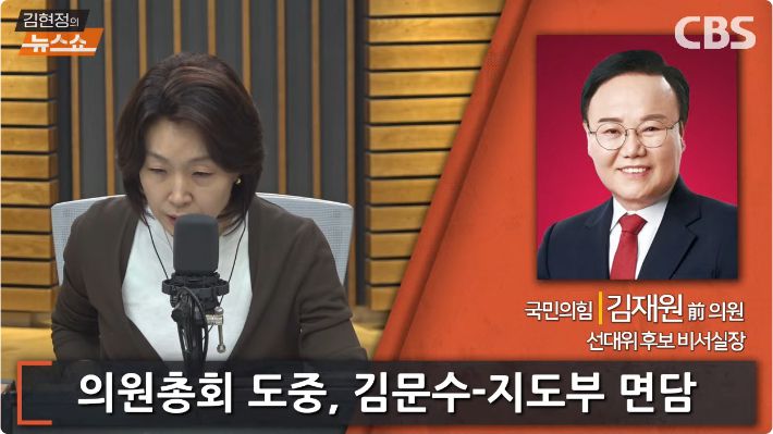 ◇ 김현정> 어제 의원총회가 열리는 중간에 지도부가 나가서 김문수 후보 면담을 하고 왔다고 하는데 그 자리에 김재원 비서실장님도 계셨다고요?