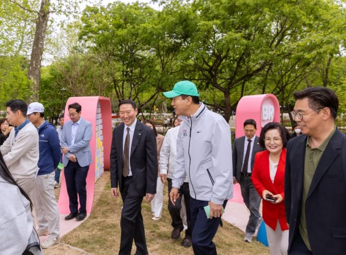 지난 5일 어린이날을 맞이해 서울 어린이대공원에 공개된 '핑크드림가든'에 오세훈 서울시장(가운데 오른쪽)과 허희수 SPC그룹 부사장(왼쪽)이 함께 방문했다./사진=SPC그룹